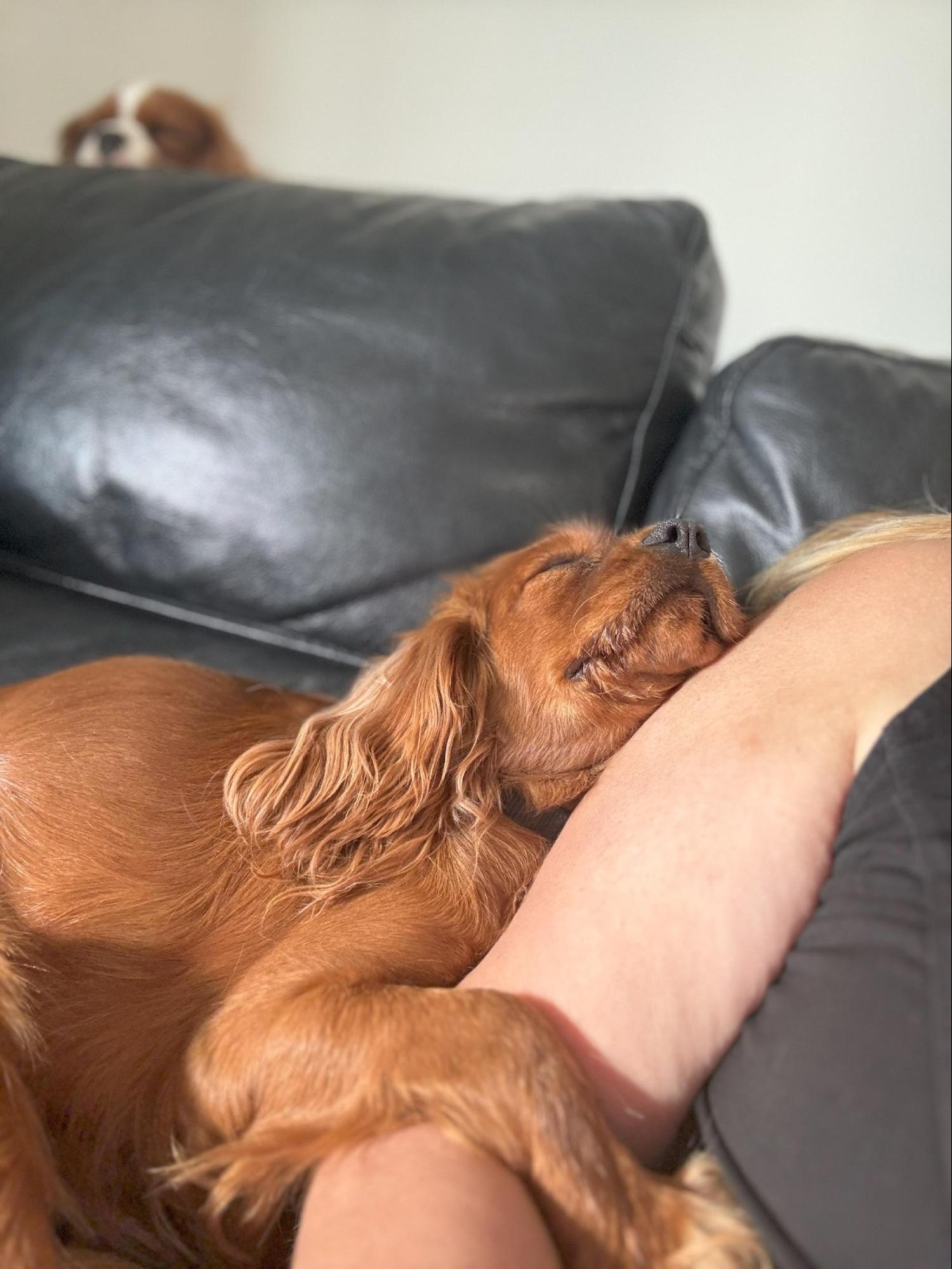 Rubbie is an absolute smooch. She loves snuggles and has a unique way of hugging you by wrapping her front legs around you. Whether it’s cuddling up on the couch to watch TV or simply enjoying a quiet moment together, Rubbie’s affectionate nature shines through. She adores chasing balls and playing, but her favourite pastime is undoubtedly snuggling up close.